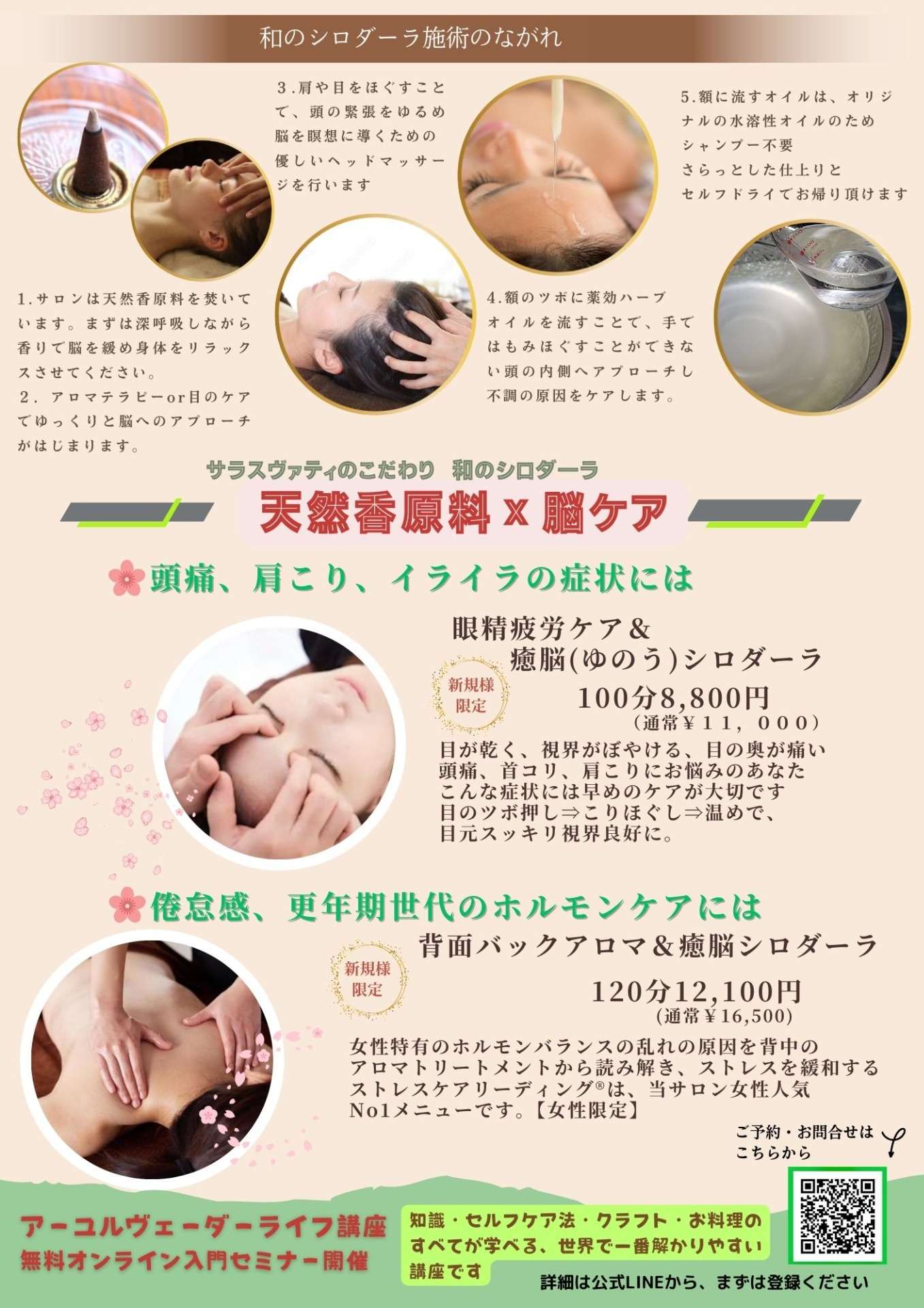 オールハンドのヘッドスパやシロダーラ(脳もみ)、背中をアロマケアで緩めてストレスリーディング®で不調の根本原因を見つけるアロマトリートメント法など